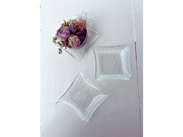 光を受けると、模様がふわりと浮かび上がる小さなガラスです。